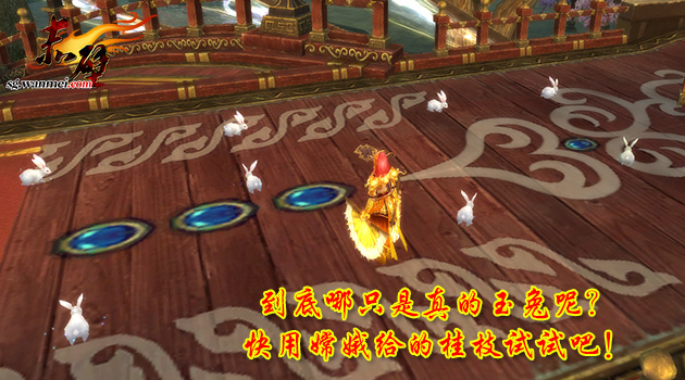 5、 交还药杵后,嫦娥姐姐请求玩家将藏起来的月兔找出来,嫦娥最了解月兔,知道它喜爱桂树枝,这样一来,大家可以拿着桂树枝一一检查鹊桥上的小白兔,普通小兔看见桂树枝就会跑的无影无踪,而月兔却会出现在你面前,用这方法找到月兔会很容易;