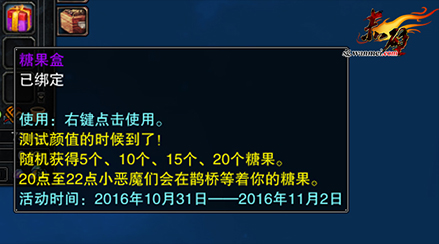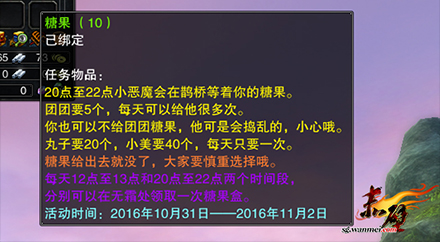 2、 活动期间每晚20:00-22:00在鹊桥处随机出现索要糖果的【小恶魔】。每次会随机要5-40个糖果,玩家给小恶魔糖果会获得奖励;