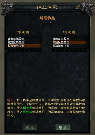 护卫传承服务是将携带的一个绑定护卫(传承者)的某一部分属性转移给另一个绑定护卫(继承者),转移之后传承者的对应属性将清空。