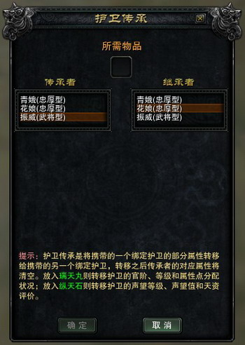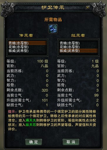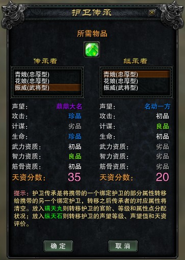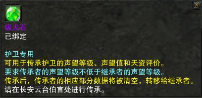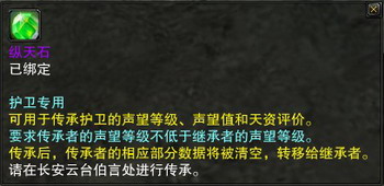 当使用“纵天石”时,传承者的声望等级、声望值和天资评价将转移给继承者。要求传承者的声望等级不低于继承者的声望等级。