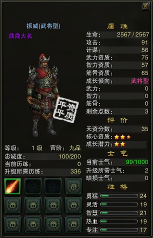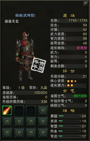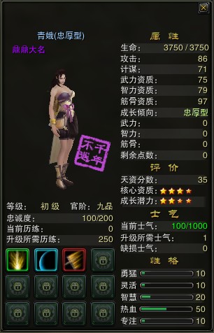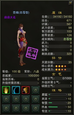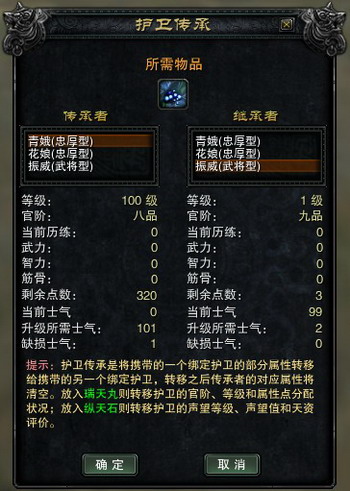 传承后,传承者的官阶回到九品,等级、全部属性点、缺损士气值和当前历练清零,当前士气变为100点;继承者的官阶、等级、属性点分配状况、缺损士气值和当前历练值继承传承者的值,当前士气值不变。