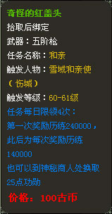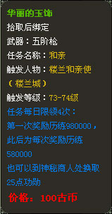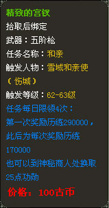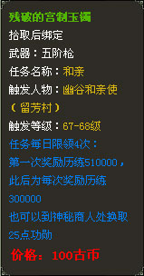 也可以将购买的和亲道具交给长安城内的NPC【神秘商人—郑迦】,换取功勋奖励。每上交一个和亲道具可以获得25点功勋值。