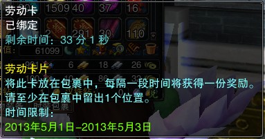 5月1日-5月3日19:00-21:00,只需找到长安未央宫前的NPC老董,即可领取劳动卡一张。只要放在背包内,每5分钟就会获得经验及相思红豆1个。收集红豆数量达6、12、18颗可以在5月20日当天到风花雪月找怜儿兑换奖励,有大量经验、烟花、商票、高级秘文罐、混沌神石、百炼马铠等你来拿!