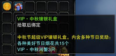 中秋节超值VIP镶银礼盒,内含多种优质的节日奖励。各种美好的节日烟花和中秋河蟹共庆节日!